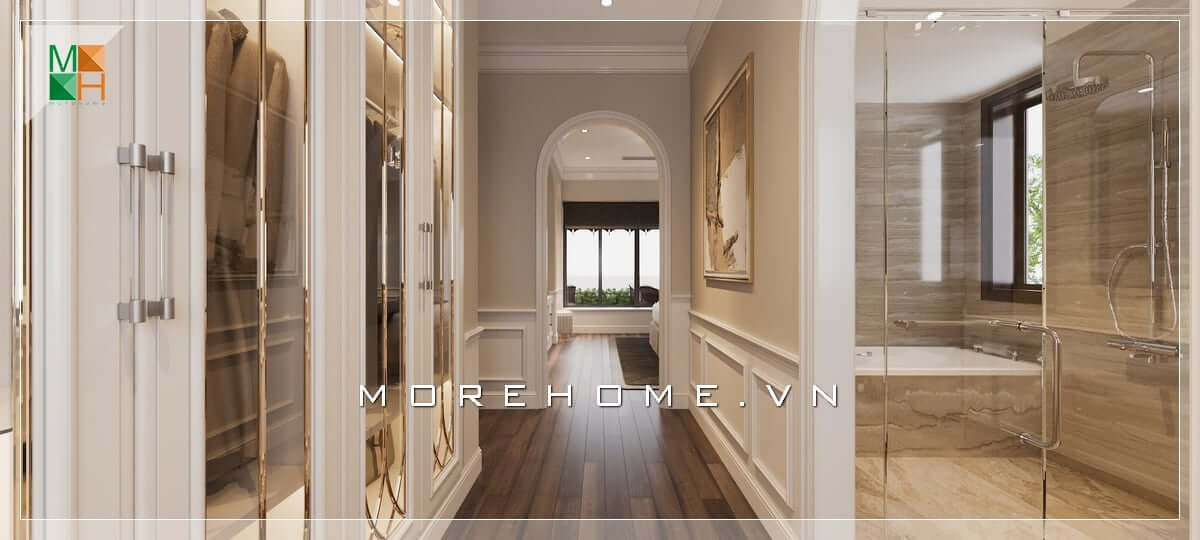 Bàn gỗ tân cổ điển kết hợp vách ngăn trang trí mạ vàng tạo nên không gian sang trọng, đẳng cấp cho phòng ngủ master cao cấp.