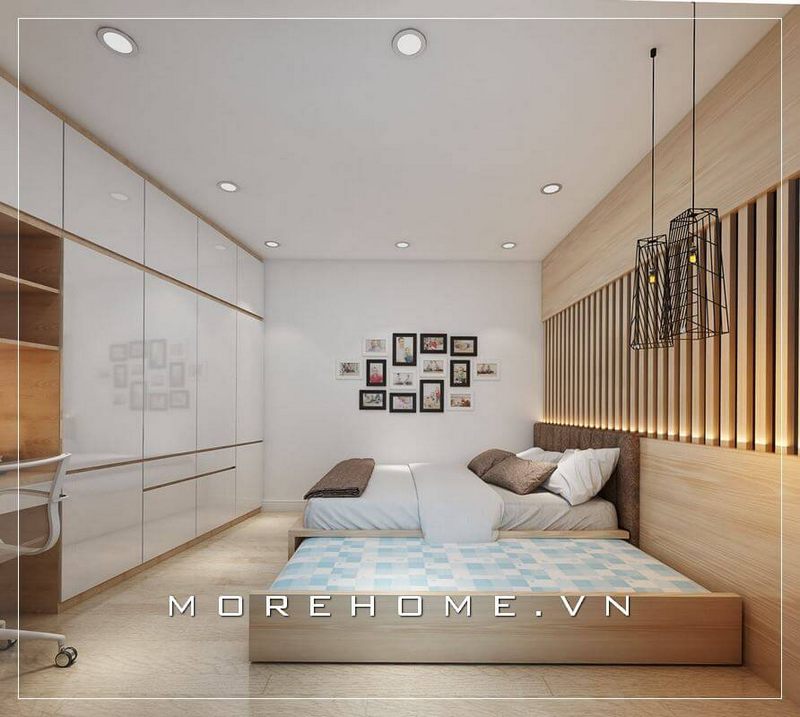 Thiết kế giường ngủ con trai hiện đại, liền kề là bàn học cùng chất liệu mang đến sự đồng bộ cũng như thuận tiện nhất cho con trong quá trình nghỉ ngơi và học tập