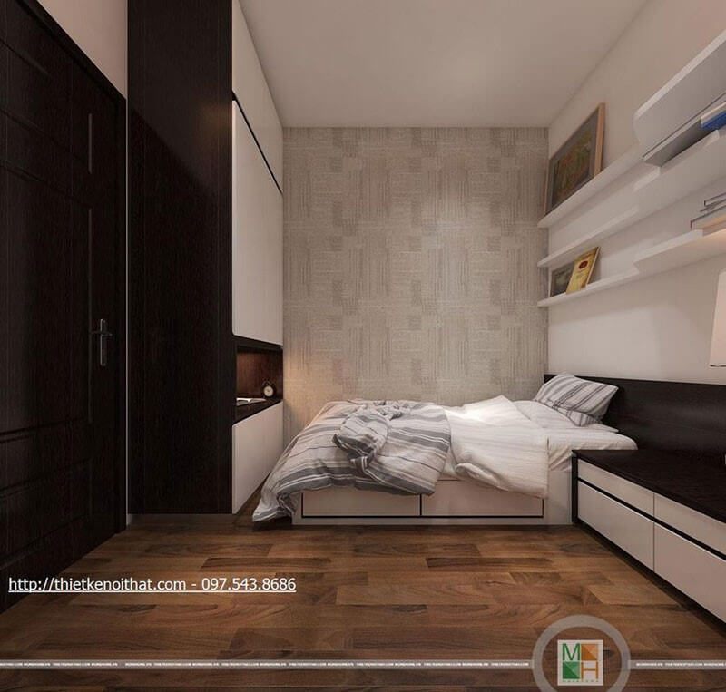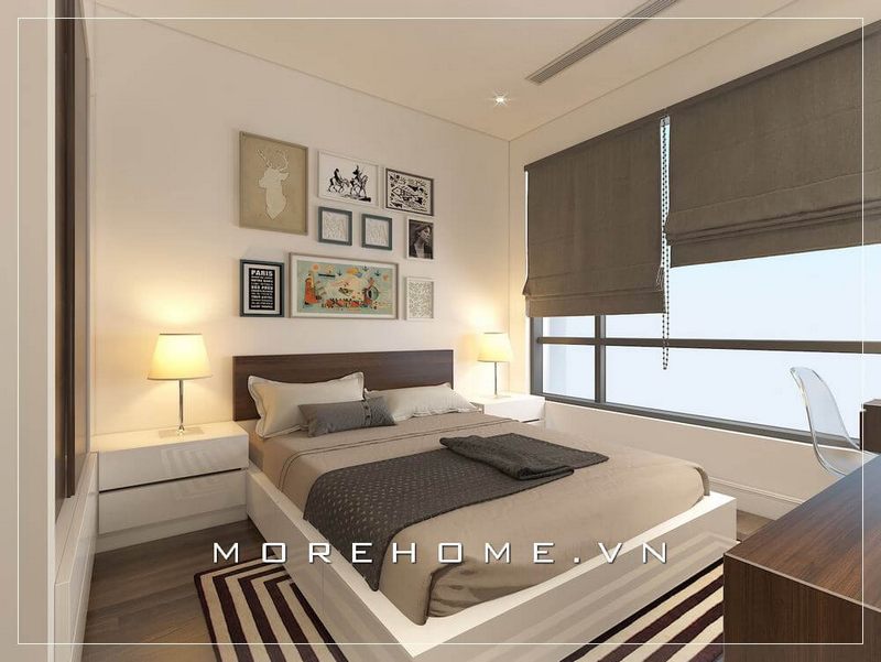 Trang trí nội thất phòng ngủ chung cư ấn tượng với giường ngủ gỗ công nghiệp màu trắng ấn tượng