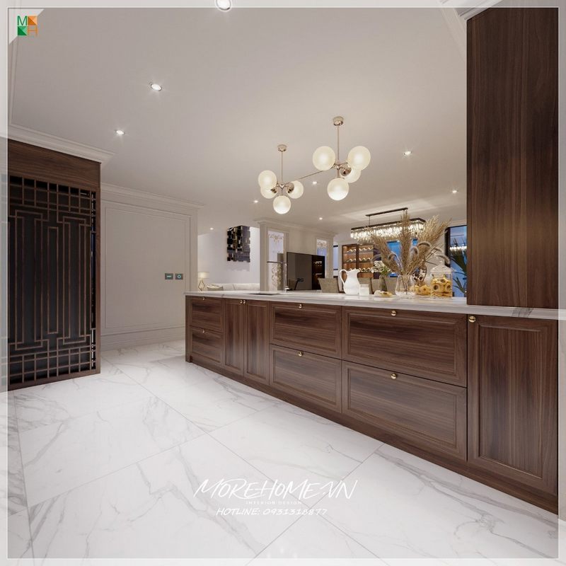 Tủ bếp gỗ óc chó tân cổ điển cao cấp, được bán với giá cao tại biệt thự Vinhomes Greenbay Hà Nội.
